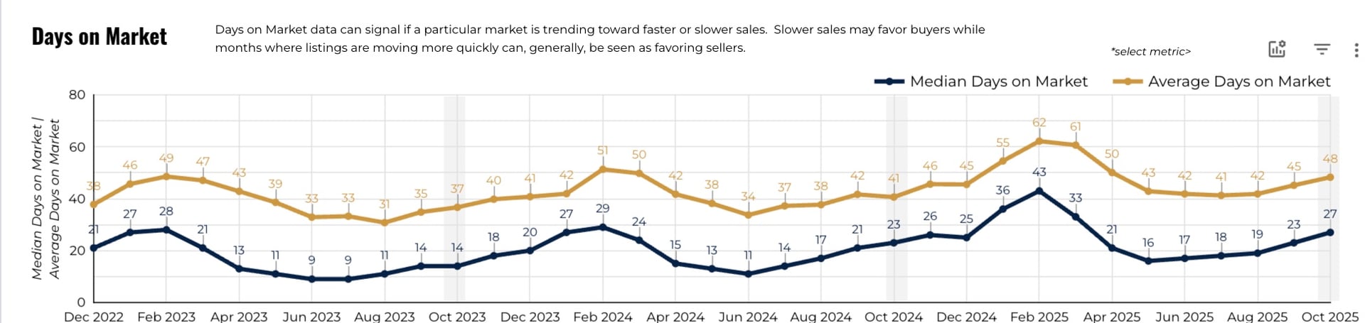 This modest increase reflects a more balanced rhythm returning to the market. Buyers have a bit more time to make decisions, but the overall pace remains faster than many pre-pandemic years. Sellers who price strategically and prepare their homes thoughtfully continue to see strong results.