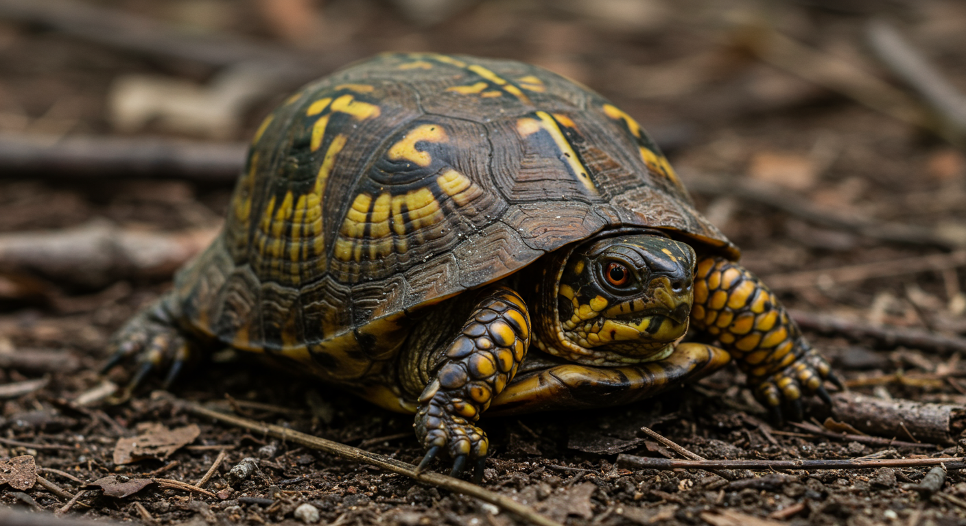 The Eastern box turtle can be recognized by its high-domed shell and distinctive hinged plastron that allows it to completely enclose itself for protection. These turtles are primarily found in forests, meadows, and near streams. They are known for their longevity, often living 30 to 40 years in the wild, with some individuals reaching over 100 years. Their populations are considered vulnerable due to habitat loss, road mortality, and collection for the pet trade.